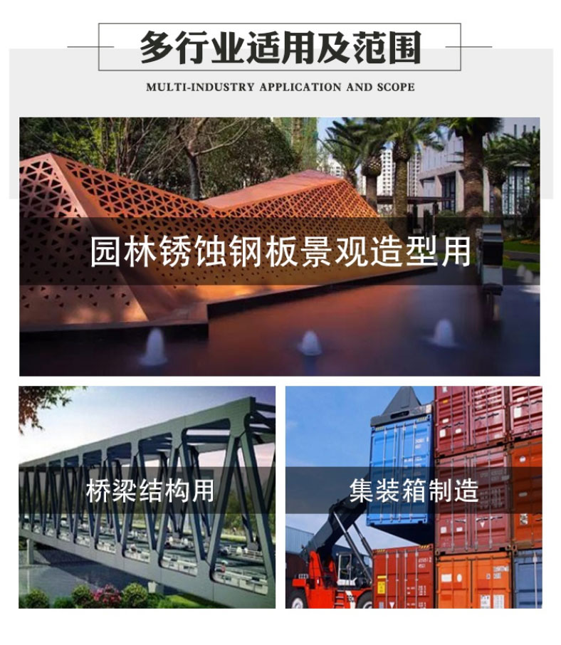 耐候板即耐大氣腐蝕鋼,是介于普通鋼和不銹鋼之間的低合金鋼系列,耐候鋼由普碳鋼添加少量銅、鎳等耐腐蝕元素而成,具有優質鋼的強韌、塑延、成型、焊割、磨蝕、高溫、抗疲勞等特性。